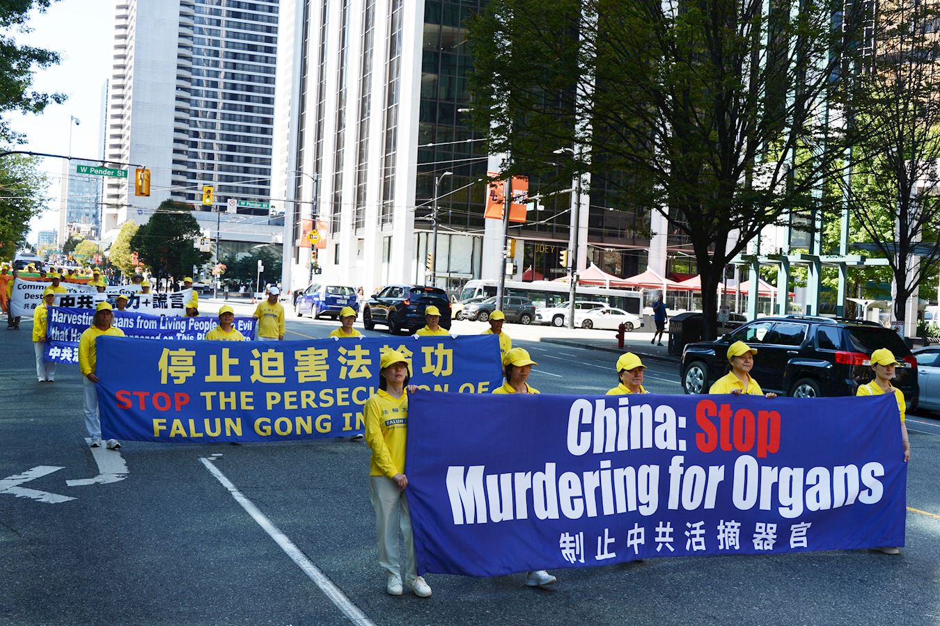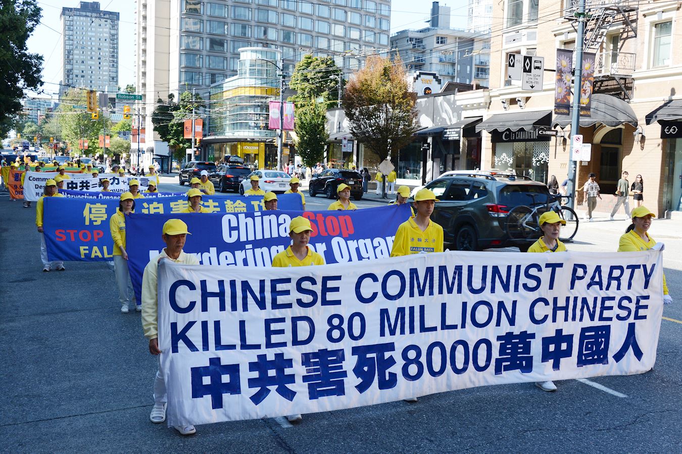 【明慧网二零二五年八月三十日】二零二五年八月二十四日,温哥华部分法轮功学员在市中心举行盛大游行,呼吁社会各界关注,共同制止中共对法轮功长达二十六年的残酷迫害,并声援四亿五千万华人勇士声明退出中共组织。沿途民众为中共的暴行所震惊,更为中共将镇压延伸到海外而愤慨。他们对法轮功团体的反迫害表示支持,还有一些民众当场就声明退出了中共组织。 图1:二零二五年八月二十四日,加拿大温哥华法轮功学员在市中心举行游行,声援4.5亿中国人退出中国共产党、共青团和少先队组织,并呼吁制止中共长达二十六年的残酷迫害。 |