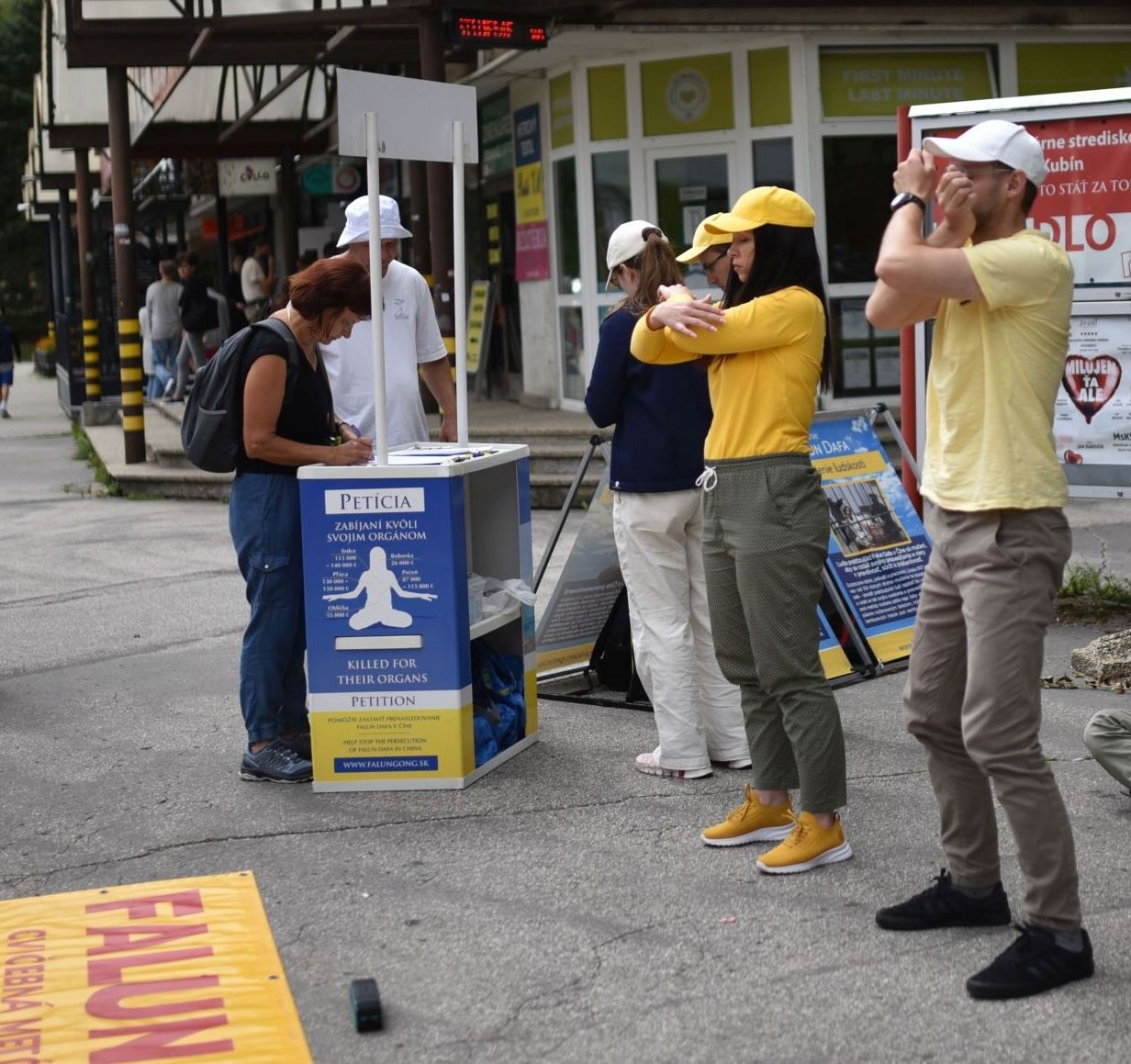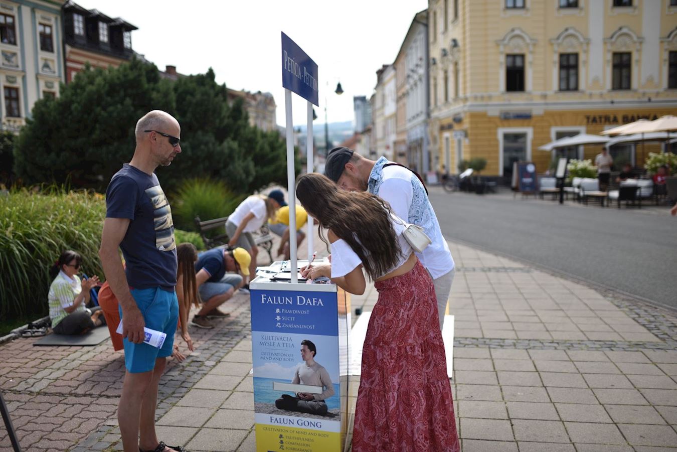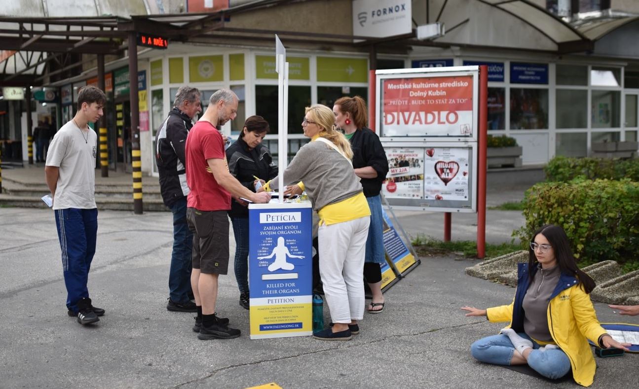 一位路人观看功法演示后很快就签名表示支持,还询问如何在班斯卡·比斯特里察学法轮功。 退休老者鲁道夫·巴霍尼(Rudolf Bahoň)表示,法轮功和真、善、忍能帮助到斯洛伐克的人们,他签署请愿书后说:“善是人类最重要的品质。” 医疗工作者哈娜·马托尼亚科娃(Hana Martoňáková)签署请愿书时说,迫害法轮功是错误的:“人们应该自由的修炼,没人能阻止他们。” 关于法轮功真、善、忍的原则,马托尼亚科娃表示:“这些是每个人都应遵循的基本原则,不仅是法轮功修炼人。我们在斯洛伐克也需要真善忍,应该实践这些原则,这样我们的生活会更美好。” “总有一天他们(中国人)也能自由的做他们想做的事。”她引用捷克斯洛伐克总统瓦茨拉夫·哈维尔(Václav Havel)的名句说:“真理和爱将战胜谎言与仇恨(Truth and love will triumph over lies and hatred.)。” 在鲁容贝罗克和多尔尼·库宾的活动 在鲁容贝罗克和多尔尼·库宾的活动分别于七月二十八和二十九日举行,尽管鲁容贝罗克当日天气不佳,但还是有许多人停下来静听真相。 在多尔尼·库宾,许多人是第一次听说法轮功和中共的迫害,他们踊跃的支持法轮功学员,一位年轻女士签署请愿书后把妹妹也带来签名;有人认真阅读真相资料,表示回去后会在网上签名;还有人在现场学炼功法。  图3~5:二零二五年七月二十九日,法轮功学员在多尔尼·库宾举办征签和讲真相活动。 |