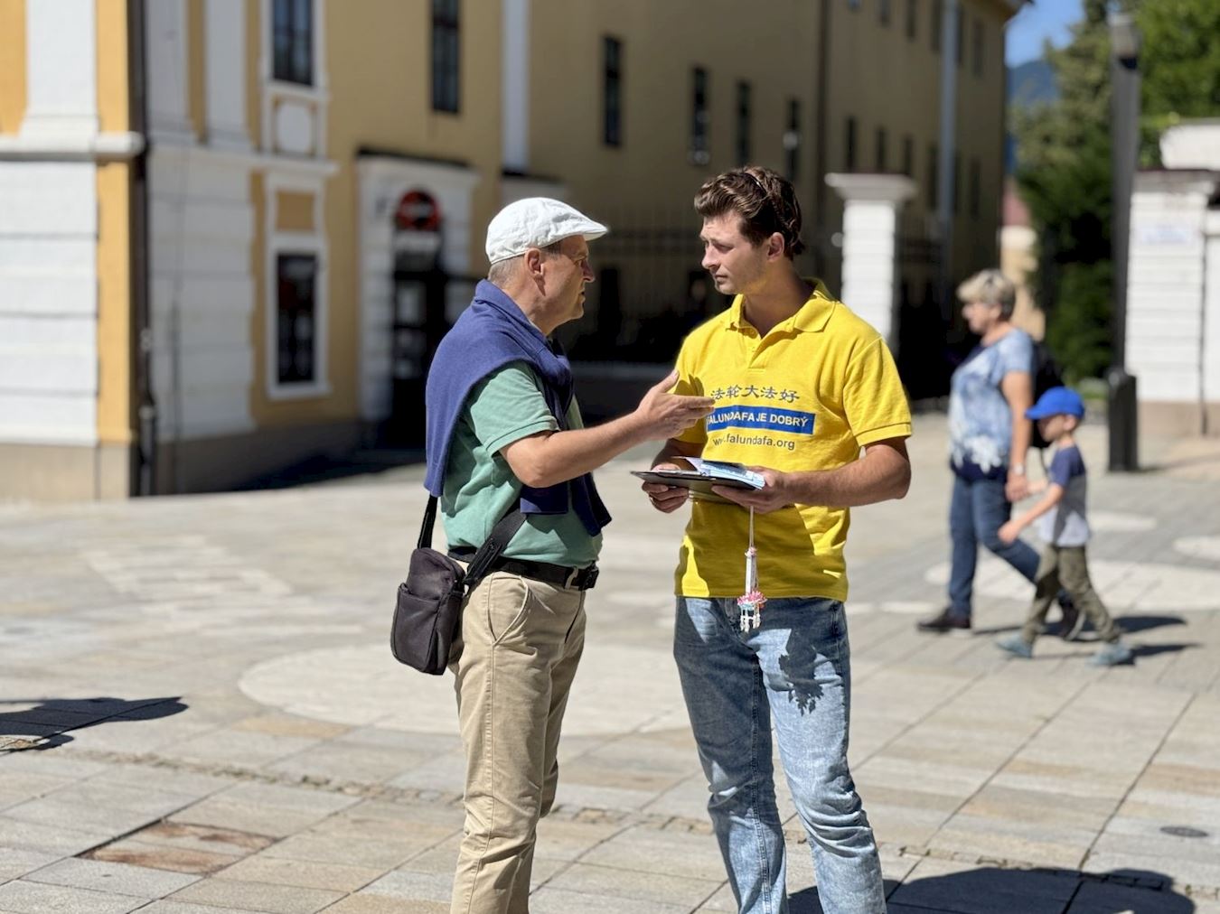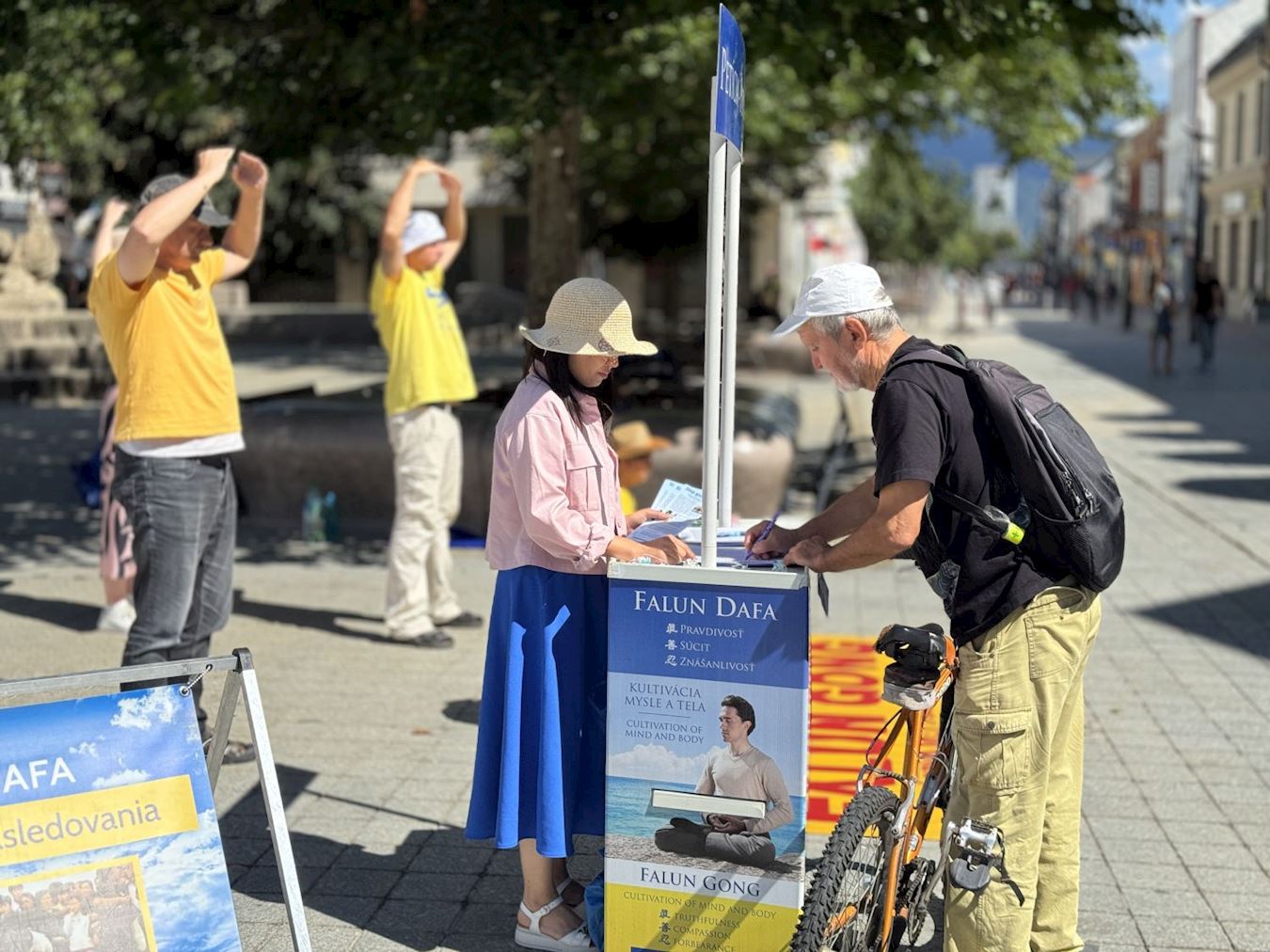 | 【明慧网二零二五年八月五日】二零二五年七月二十五日至八月一日,斯洛伐克的部分法轮功学员在中部和西部多个城市举行了讲真相和征签活动。他们走访了班斯卡·比斯特里察(Banská Bystrica)、鲁容贝罗克(Ružomberok)、多尔尼·库宾(Dolný Kubín)、马丁(Martin)、日利纳(Žilina)和特伦钦(Trenčín)等地。活动期间他们展示五套功法,与当地民众交谈,让大家了解法轮功在中国被迫害的真实情况,有上千名民众在呼吁停止迫害的请愿书上签名。 班斯卡·比斯特里察人:斯洛伐克需要真善忍 七月二十五日,学员们来到第一站——中部重镇班斯卡·比斯特里察。活动地点在SNP广场,当天阳光明媚,许多居民驻足了解真相并签署了请愿书。  图1~2:二零二五年七月二十五日,法轮功学员在班斯卡·比斯特里察举行讲真相活动。 |