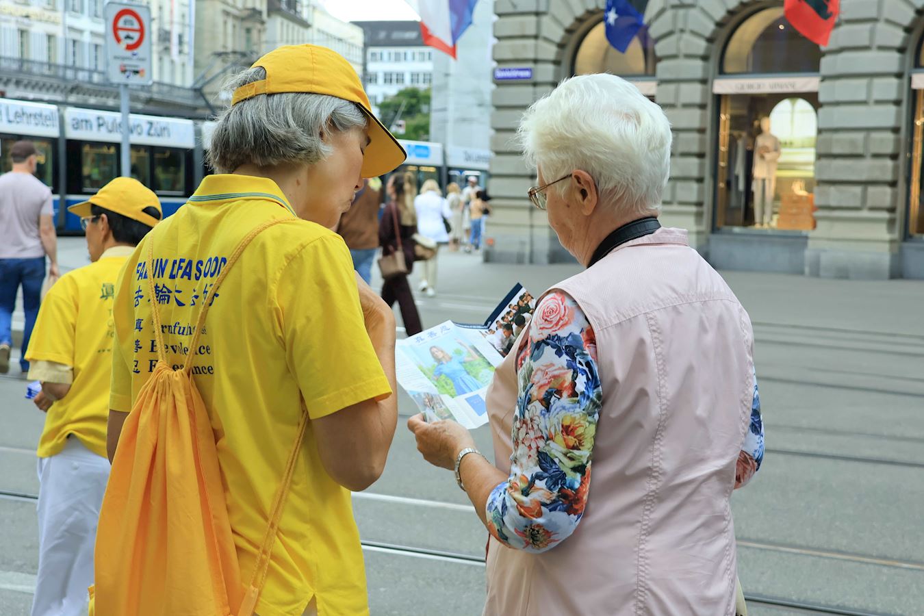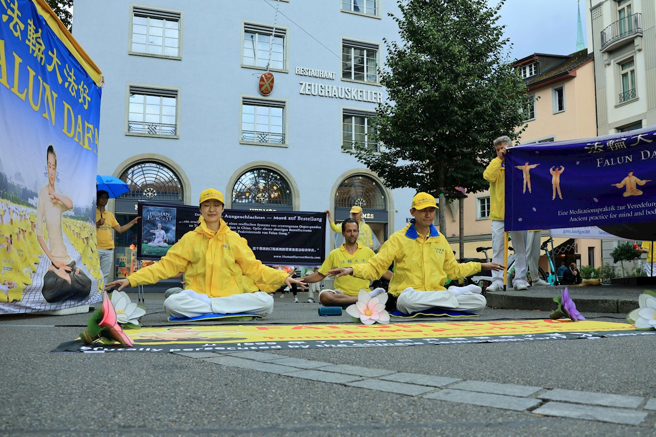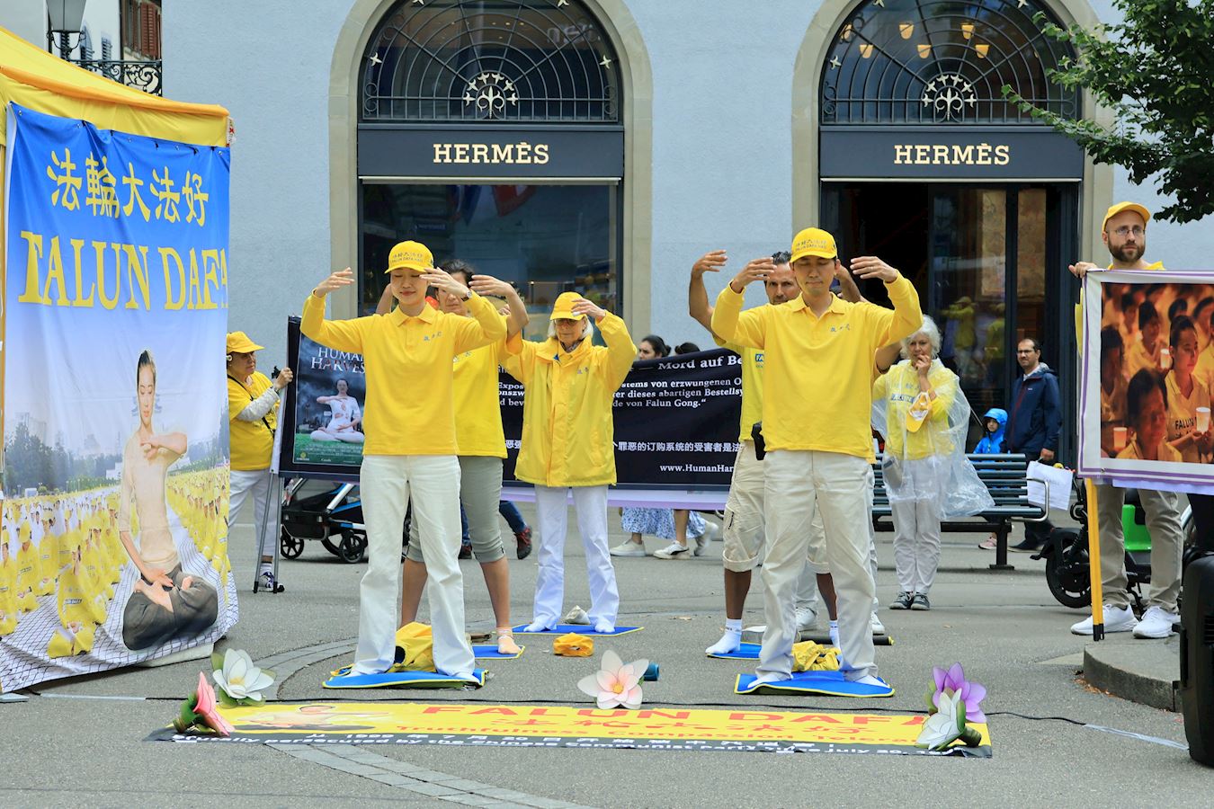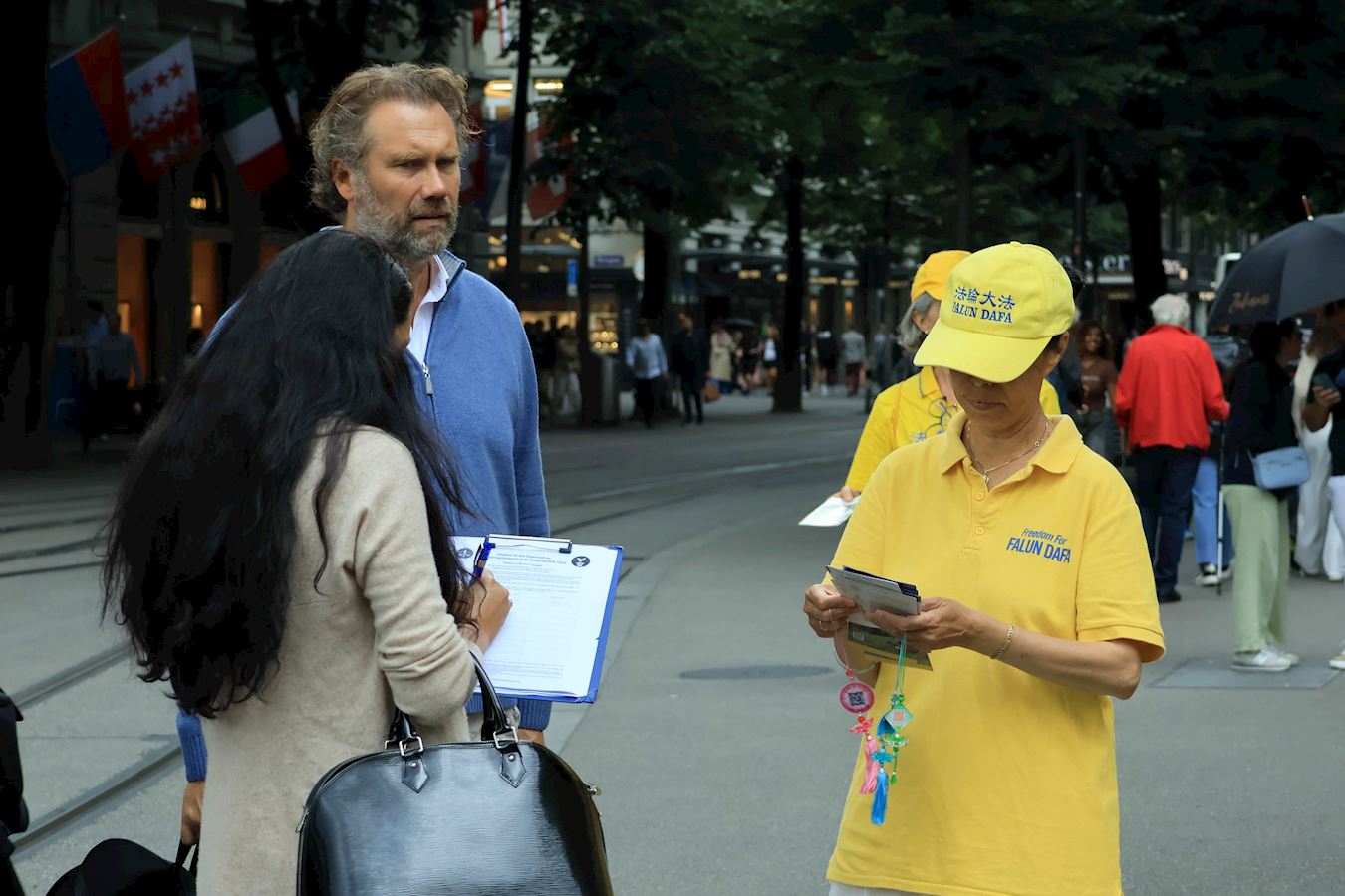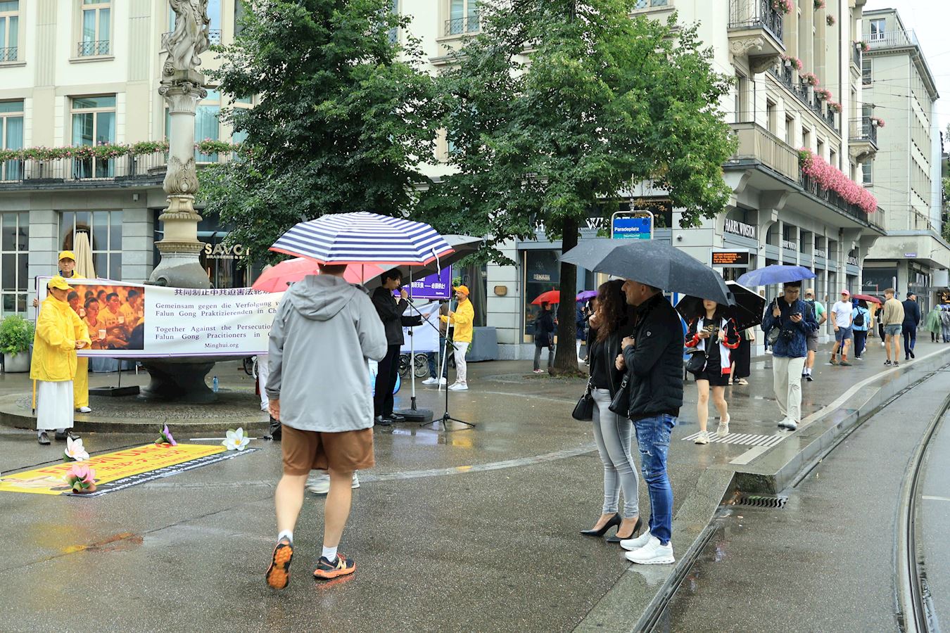 | 【明慧网二零二五年八月六日】(明慧记者高思羽瑞士采访报道)“听到演讲后,我深受触动,又看到征签信息台,我就过来签名,希望能支持法轮功学员。”“看到他们在大雨中矗立不动,我很感动,我想他们一定是为了什么重要的事情,我想知道这是为了什么?”二零二五年七月二十六日下午,在瑞士苏黎世市中心的军械库广场(Zeughausplatz)很多路人放慢脚步,阅读横幅上的内容,倾听演讲,与法轮功学员交谈。 当天,法轮功学员再次通过演讲及功法演示告诉路人法轮大法的美好,特别揭露了中共自一九九九年以来对法轮功学员的血腥迫害,呼吁更多人共同制止这场持续了二十六年的迫害。很多人第一听闻法轮大法,但当得知法轮功学员因信仰真、善、忍而遭到迫害,甚至被活摘器官,被酷刑折磨,失去生命,他们纷纷签名支持学员反迫害。  图1~3:功法演示,展现大法的美好 |