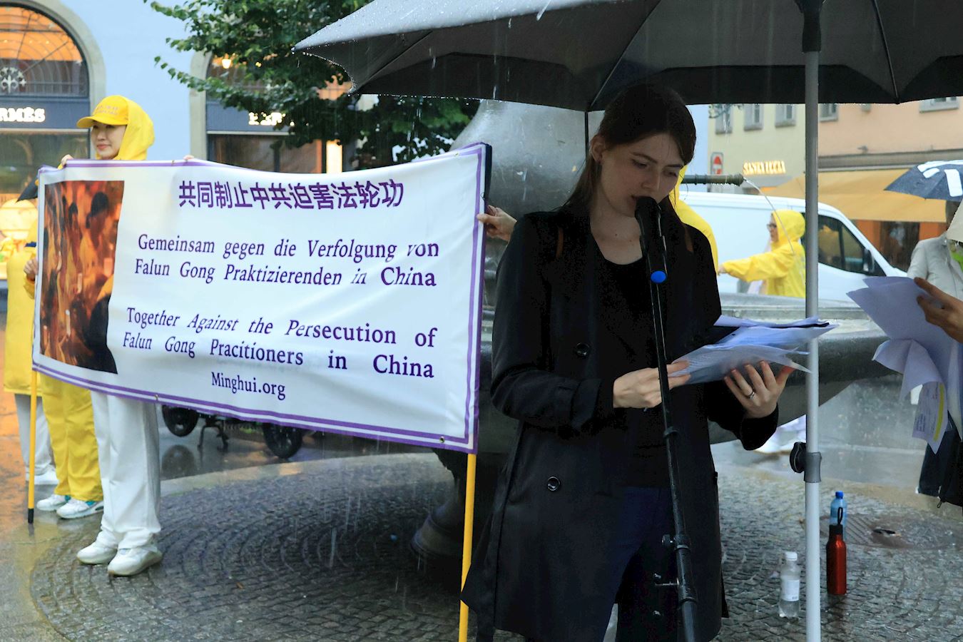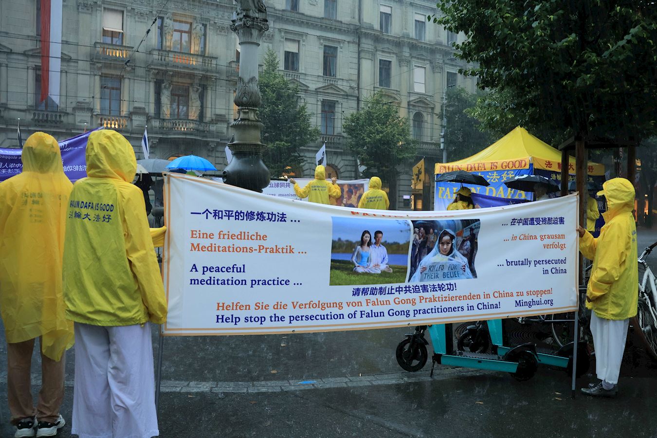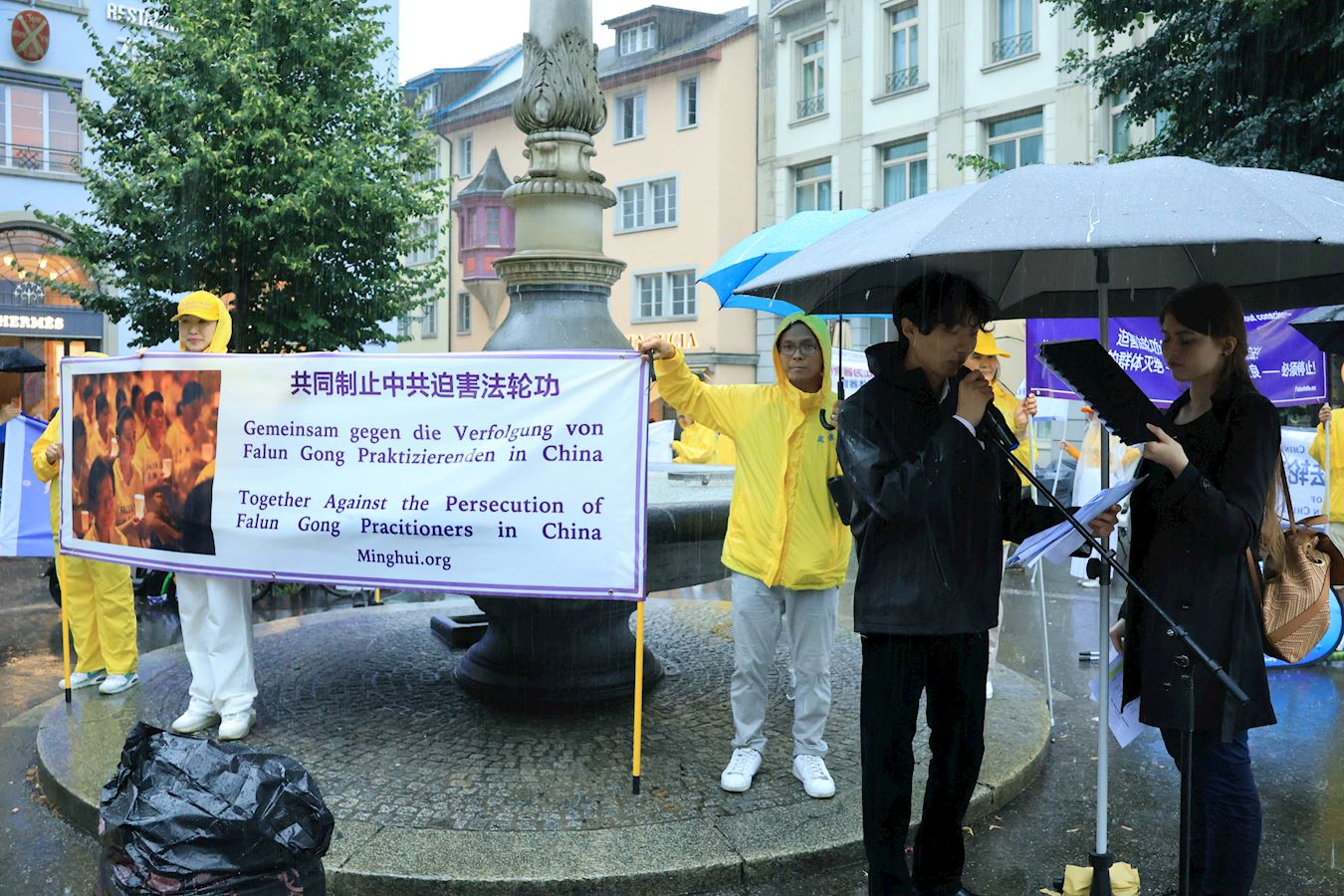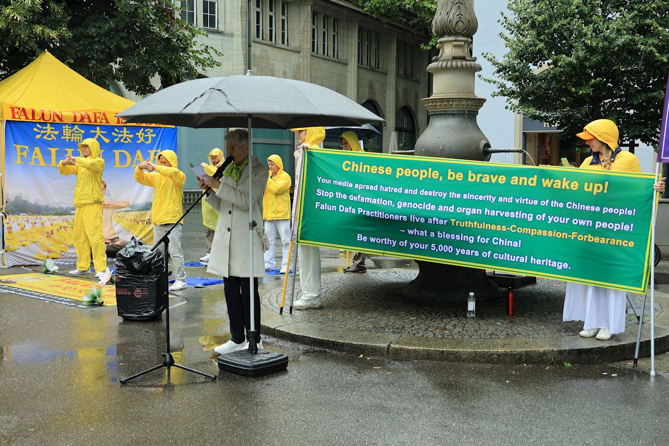 真善忍如此美好 要让更多人遵循 来自莫斯科的医学教授奥尔加·斯米尔诺娃(Olga Smirnova)第一次听闻法轮大法,她非常认同法轮功学员遵循的真善忍准则,她认为:“这三个准则非常重要,特别是对我的学生们,那些年轻人,为了他们的未来,他们应该知晓这样的准则。等我回到莫斯科,我会告诉他们。”因为语言不同,她无法表达自己听闻法轮功学员遭到迫害的感受,但是她在签名支持后告诉学员:“非常感谢你们如此重要的付出,你们的存在非常重要。” 瑜伽师卡门·阿布利丁格(Carmen Ableidinger)非常高兴终于找到了法轮功学员。在瓢泼大雨敲打帐篷的伴奏下,她谈起自己第一次偶遇法轮功的经历。当时她正处于人生低谷,在马略卡岛度假时看到法轮功学员炼功:“他们看上去是如此的幸福,如此满足,人不需要拥有很多,但充实满足非常重要。”她对大法非常感兴趣,也跟着炼了一个半小时:“哇哦,感觉太棒了,”她的喜悦溢于言表:“那是如此的美好,炼功后我感到心中平衡,很充实,我真的非常高兴,很高兴能认识法轮大法。”回来后她一直在网上寻觅,直到活动当天:“我现在知道苏黎世的炼功点了,我太高兴了,找到了你们(法轮功学员),真是太棒了,非常感谢。” 看着横幅上用中英德的真善忍三个字,她照着拼音,念着中文的真善忍,并说道:“非常、非常好,真、善、忍,非常好,应该让更多人照此去生活,并应有深刻理解。那样的话,我们就会拥有一个和平的世界,而不是现在这般灾难性的,也不会有战争。这非常、非常美好。”她还询问是否可以将真、善、忍拍照留念,留影后,她继续说:“我会放在自己的动态中,实在是非常非常好。” 来自西班牙,现住在瑞士的健康教练伊丽莎白(Elisabet)也认为真善忍:“是如此美好,是我们应该遵循的,这三个字应该出现在每个国家的国旗上。”在得到了网上免费学炼法轮大法的讯息后,她也打算学炼大法,并要去苏黎世的炼功点:“因为这(修炼法轮大法)有助于提高我们的意识,让我们内心更平静,这正是当今我们世界上每个人都应该学炼的。” 迫害法轮大法是一场灾难  图5~9:大雨中演讲,呼吁人们能帮助早日停止迫害 |