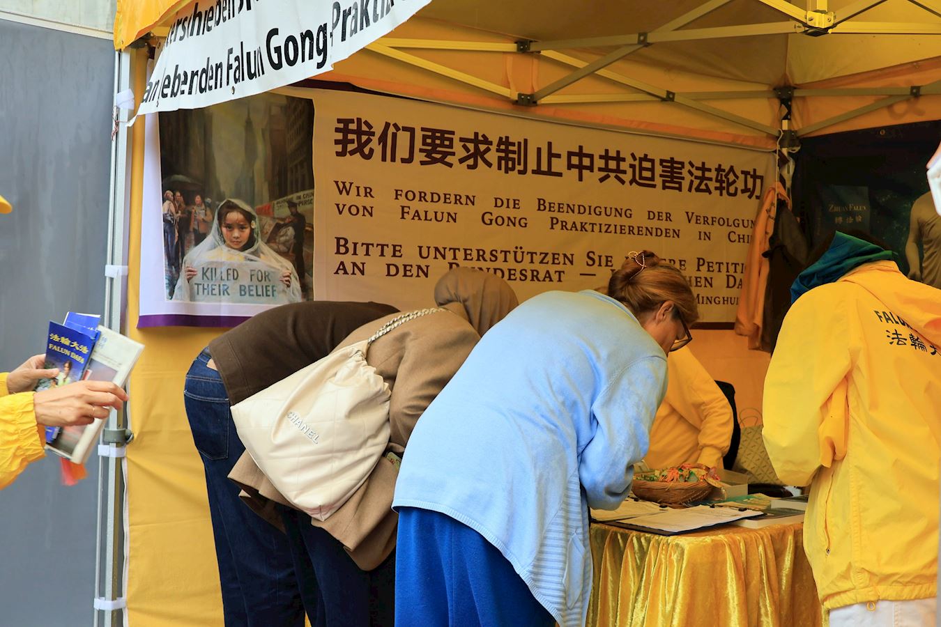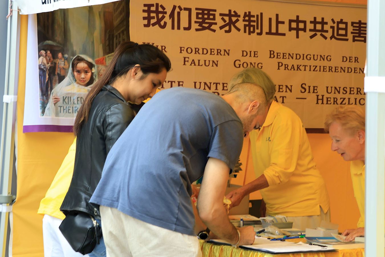 “(迫害)这是一场灾难。”谈及中共对法轮大法的迫害, 阿布利丁格说:“因为(法轮大法)这个功法非常好,让人感到身体舒服,心情舒畅,让人感到自由,心中充满爱,我相信禁止这功法的(中共)是想让人变得消极。因为这(功法)是正面的,而(中共)他们希望做负面的事情,他们对积极的人与事没有兴趣,他们只是希望按部就班的人,而不是那些有正面的,有创造力的人。中共他们不关心生命,只是迫害民众,掠夺钱财。” “中共居然禁止如此美好的功法,太可怕了。”伊丽莎白惊呼,她认为:“中共甚至要禁止法轮大法,这正表明大法非常有力量。”但是迫害:“已经持续二十六年了,太长了,我希望这一切不会再持续多年,我希望能尽快结束,这必须停止。” 退休律师芭芭拉·韦伯(Barbara Weber)在签名后说:“中共在中国的所为糟糕透顶,毋庸置疑,这是一个犯罪系统。”谈及中共活摘法轮功学员器官的罪行,她激动地说:“绑匪或黑手党从事器官交易,这很糟糕,但你不能指望黑手党或绑匪会有所改变。但一个国家,一个国家政权竟然做这种事,这是不可接受的!” “这(活摘器官)让我感到愤怒,让我感到悲伤,我认为这种行径非常可怕。”家庭教师沙伊贝(Scheibe )女士也在签名后说:“我坚决反对全世界的共产主义独裁政权,不应该让他们强奸民众。” 要让更多人了解真相  图10~14:人们接过传单,了解真相后签名制止迫害,并将告诉更多人 |