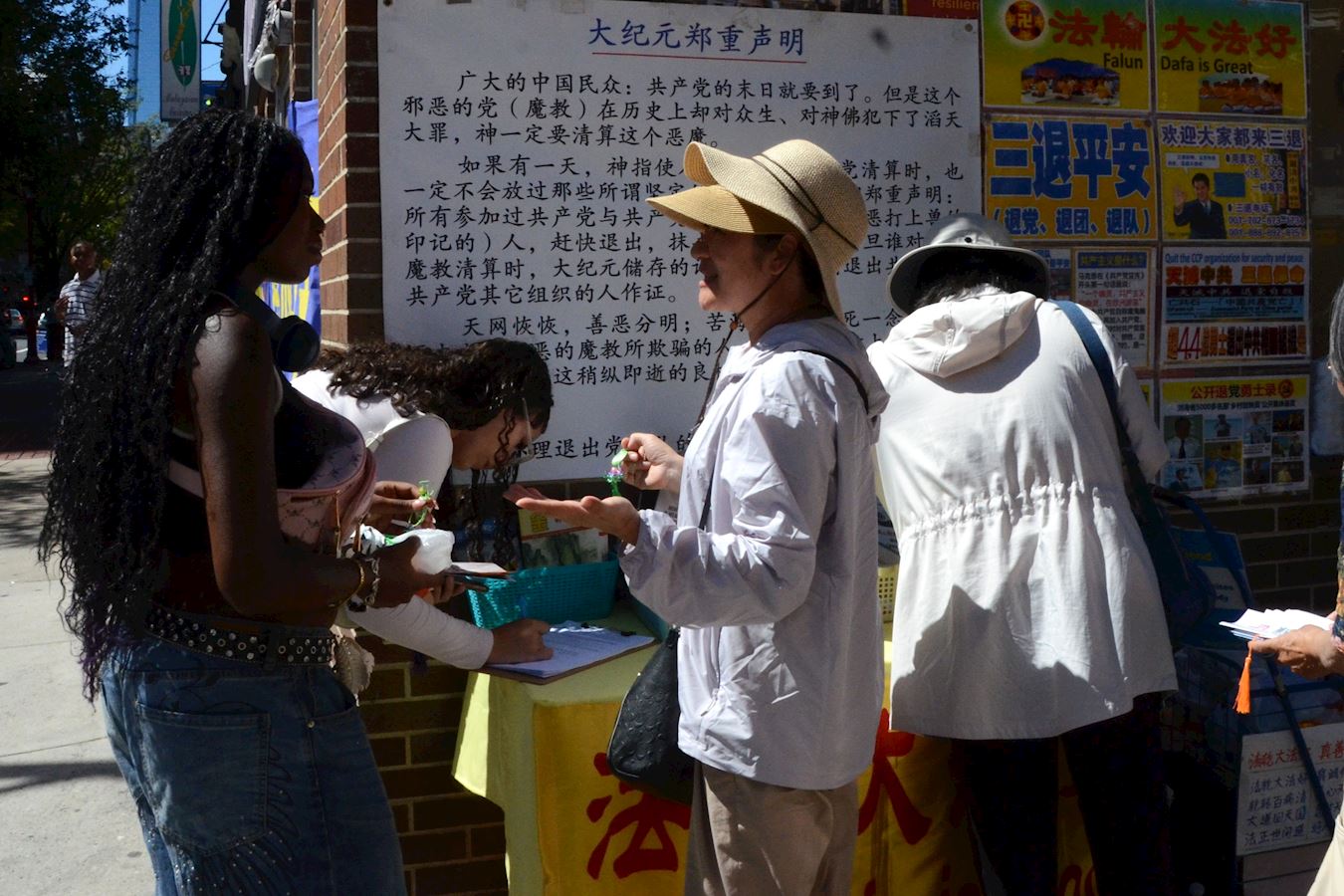 当天的集会受到了亲共人士的干扰。法轮功学员桑托什·克里希纳穆提(Santosh Krishnamurthy)描述说,一名亚裔男子骑着吵闹的摩托车多次在集会现场周围转圈,加大油门以噪音掩盖演讲的声音。集会主持人亚历克斯·卢昌斯基(Alex Luchansky)强调,这就是中共在海外镇压手段的一种形式:“这就是中共流氓在干的事,他们在干扰我们享有的第一修正案权利。这是美国,不是中国。可事实是,这样的事情就发生在这里。这就是中共的真实面目。” 民众的声音:支持与呼吁关注 在集会现场,许多路人表达强烈支持“三:退.”,强调集会的意义在于提高公众认知。 惩教工作人员尼吉娅·西尔维森(Nijeea Cirwithen)第一次听到活摘器官真相后,她流下了眼泪,称这是“毫无人性的”,并说:“这些器官是人们生存必需的,你不能从人身上随意剥夺。”对于四亿五千万人三:退.,她感慨:“这个数字太大了,让我觉得自己很渺小。我能做的就是支持你们。”  图9:二零二五年八月三十日,惩教工作人员尼吉娅·西尔维森(左)在费城唐人街。 |