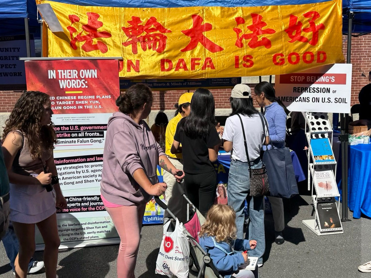 | 【明慧网二零二五年九月二十八日】美国麻州及罗德岛州部分法轮功学员于二零二五年九月二十日参加了一年一度的麻州北部城镇安多佛(Andover)的大型庆祝活动,法轮功学员设立展位,传递法轮大法真相及演示优美祥和的功法。集市中游人如织,有华人表示法轮大法是闹市中的一股清流。 九月二十日周六的庆祝活动是安多弗最大的年度社区活动,有音乐表演、美食、儿童区、趣味活动及啤酒和葡萄酒花园等。据组织者介绍,今年安多佛的庆祝活动吸引了二百多个组织及商家参加。当天,人们摩肩接踵往来于各个摊位。法轮功的摊位有写着“法轮大法好”的横幅和各类图片展板,述说着法轮大法带给这个世界的美好,带给人们身体健康,吸引很多游客前来关注。  图1~5:二零二五年九月二十日一年一度的麻州北部城镇安多佛(Andover)的大型庆祝活动,法轮功学员设立展位,吸引很多游客前来关注。 |