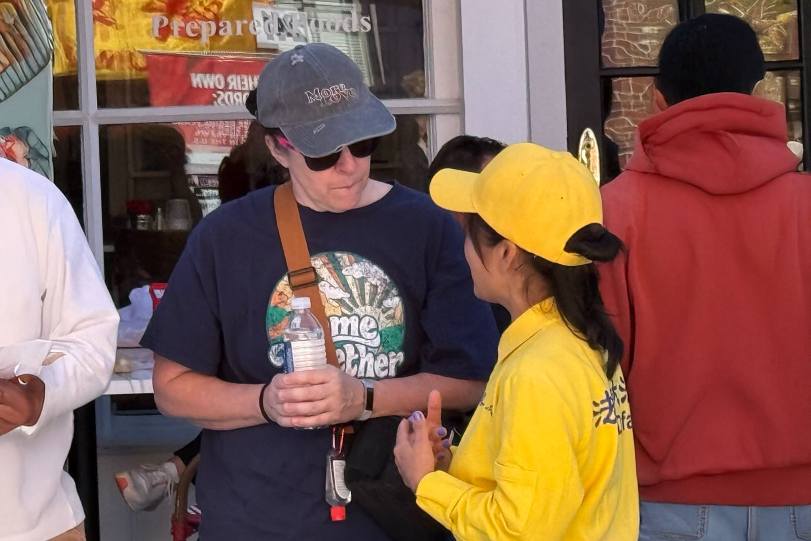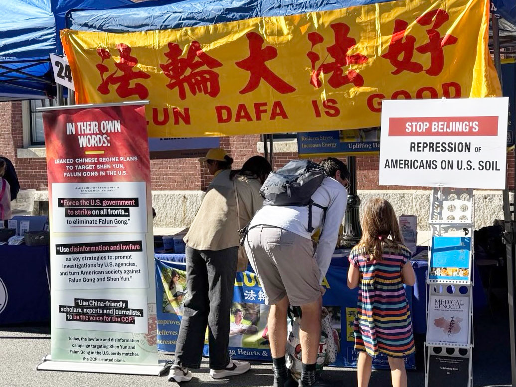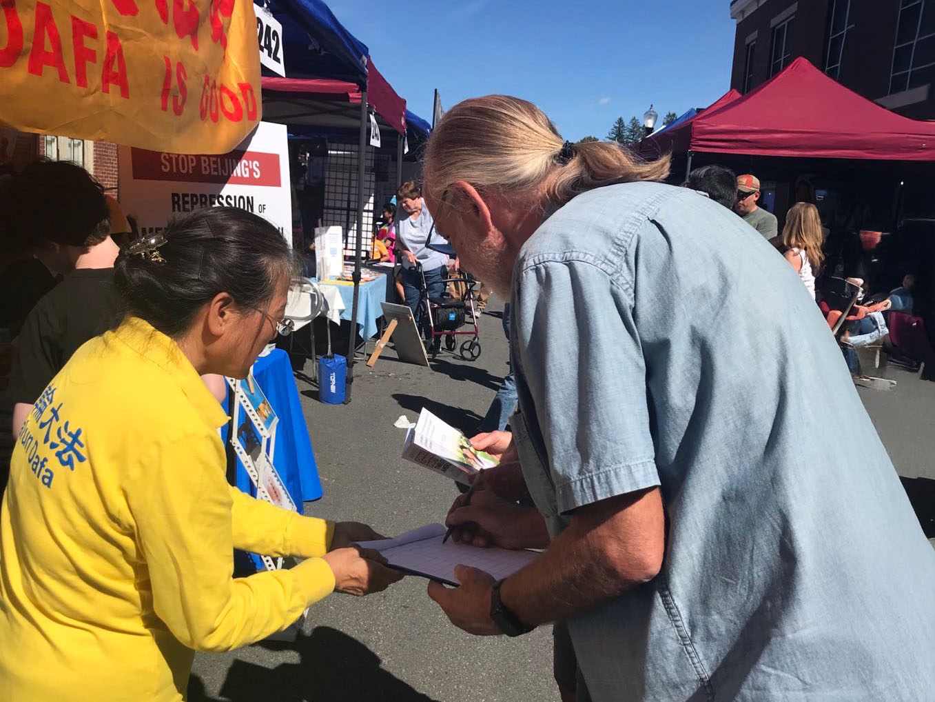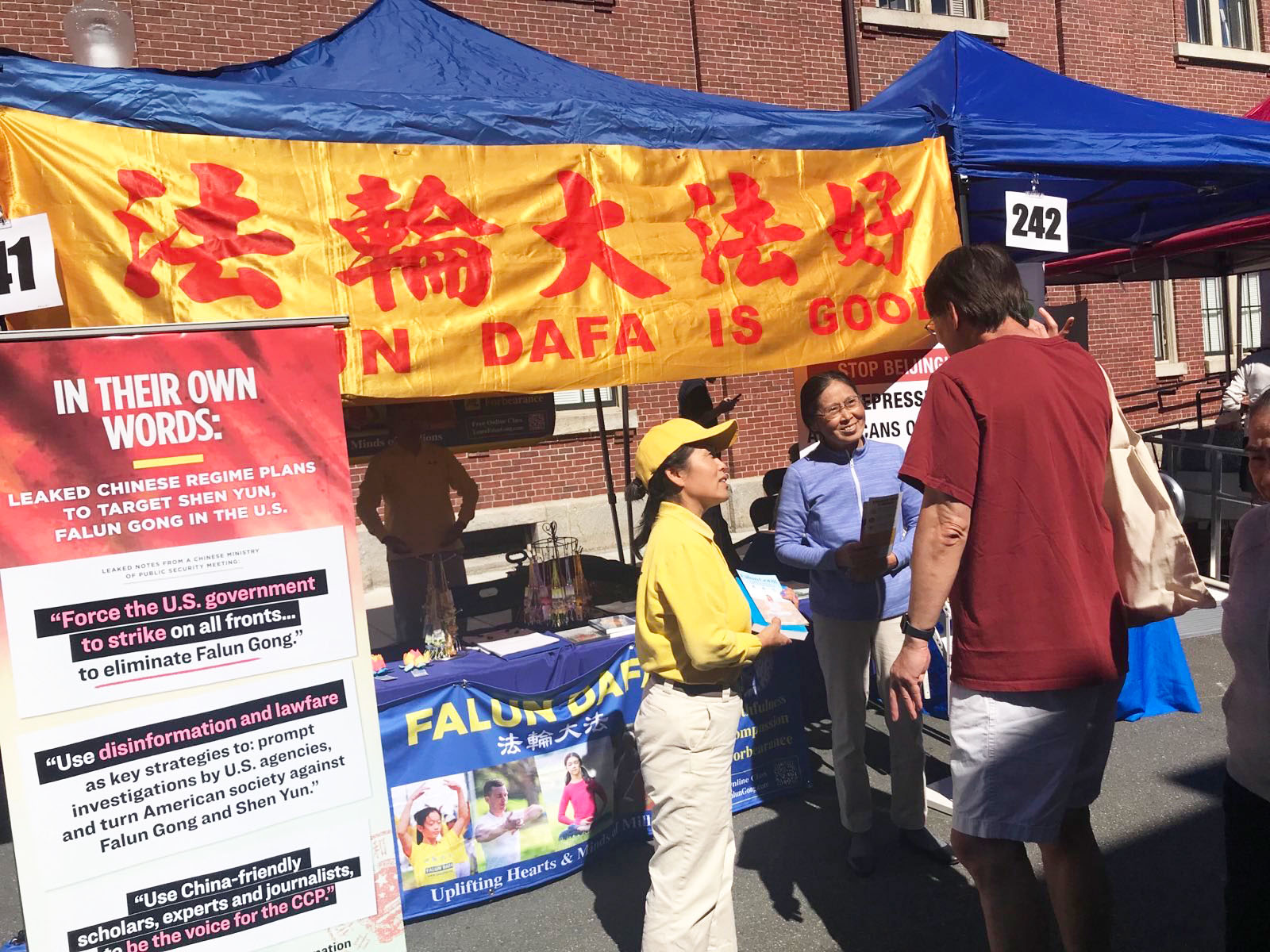西人男士喜逢大法 :“冥冥中似乎在找寻” 法轮功摊位独树一帜,有各类图片展板述说着修炼大法带给世界的美好,带给人们身体的健康和道德的升华,并告诉民众中共迫害法轮功的邪恶,提醒大家“中共跨国镇压的触角就在你的身边,已经伸到美国及世界各地”。有民众表示,在纷乱与迷茫的世局中,法轮大法就象是一个“指路灯”。 一位58岁的西人男士是成功的商业人士,他驻足在大法摊位前翻阅着各种真相杂志,他表示自己完全认同法轮功的法理。 这位男士回溯自己走过的路,庆幸没有被金钱和名誉所困,及时抽身出来游览了世界各地,拜访寺院道观,仅泰国就去了十几次。他说:“我冥冥中似乎在找寻着什么?今天幸运地遇到了法轮大法,希望能好好深入了解一下。”离开前这位男士和法轮功学员相约周末到波士顿公园学炼功法。 华人:认清中共 未来才有好日子 持续六个小时的活动始终人来人往,热闹异常。一位来自中国大陆河北省的华人老先生在大法摊位前竖起大拇指,表示支持法轮功。他说,街头巷尾的人声、叫卖声,及夹杂着快节奏的现代音乐,都非常嘈杂,而法轮功摊位人人祥和,炼功音乐舒缓平和,如闹市中的一股清流,使他感到很舒服。 华裔面孔的一家老小,在法轮功摊位前多次出现,他们享受着秋日里阳光的温暖、人与人之间灿烂的笑容,同时也从大法摊位拿走一份份真相传单和带有“真善忍”真相书签挂件的手工莲花。 在安多佛生活了二十几年的一位华裔男子路过法轮功摊位,他表示法轮功学员做的好,有勇气、有担当,是中国的希望。当今中国腐败遍地,民不聊生,连讲真话都很困难……他因为在网络上说了几句实话而被威胁、被删除帐号。他感叹,如古人所说“危邦不居”,虽然思念家人,但为自己远离中共,生活在自由的美国而庆幸而感激。 这位华裔男士呼吁更多的华人认清中共,象法轮功学员一样站出来,未来才会有真正的好日子。