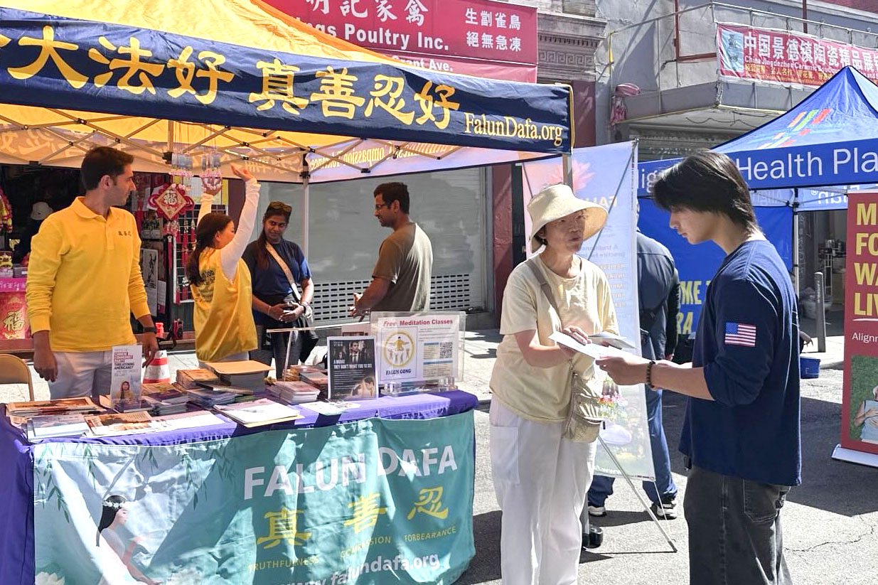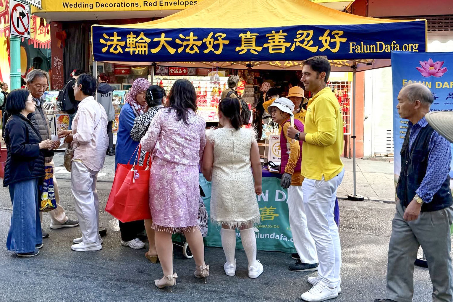 | 【明慧网二零二五年九月三十日】二零二五年九月二十七日和二十八日,法轮功学员在旧金山中国城中秋街会设置展位,向过往行人和游客传播法轮功真相,揭露中共对法轮功的迫害。 在两天的摆街会活动中,有不少民众在“制止中共活摘法轮功学员器官”征签表上签名。还有的在现场学炼法轮功功法。  图1~5:二零二五年九月二十七日和二十八日,法轮功学员在旧金山中国城中秋街会讲真相。 |